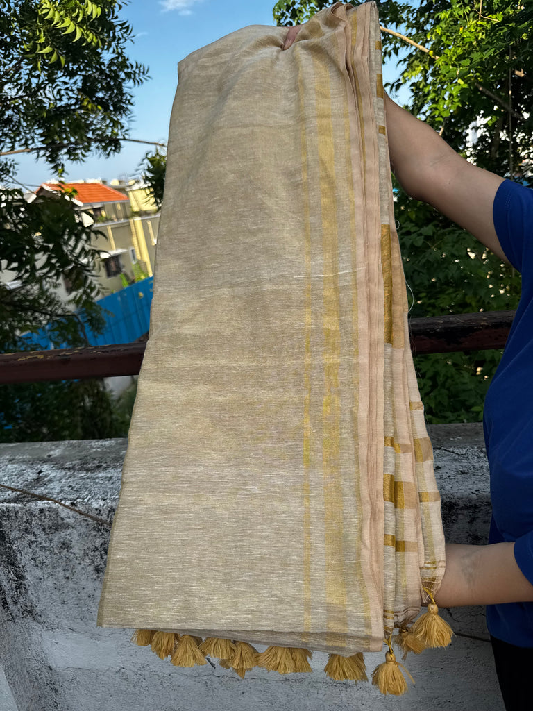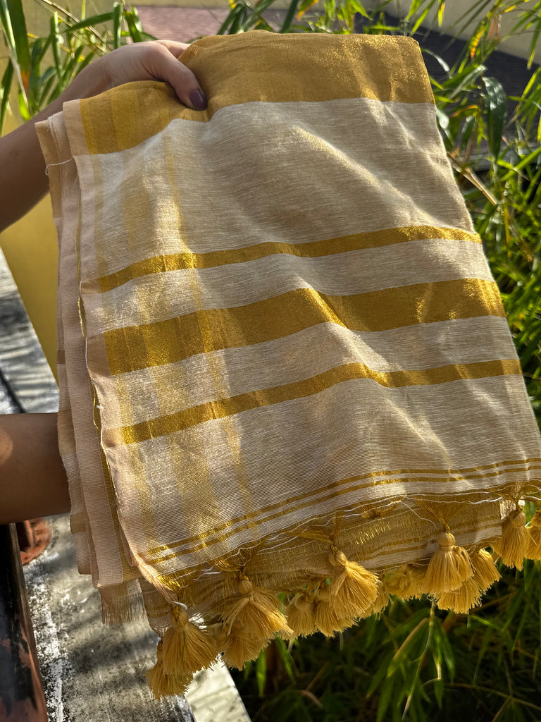 White gold tissue cotton jute finish saree with running blouse material. 1st 2images are the same saree in sunlight last 2 images is without sunlight.