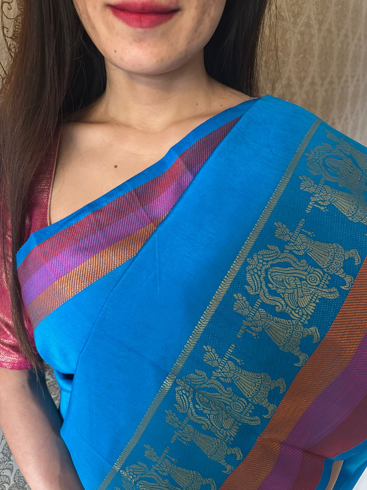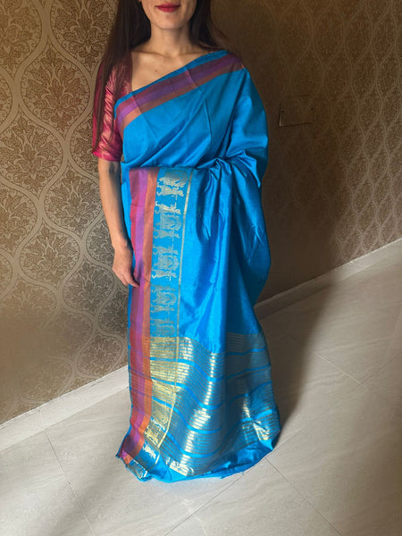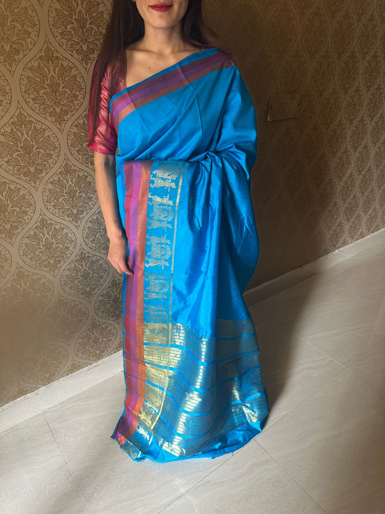 Silk saree ( not pure silk ) with running blouse material. Saree has small stain in pallu ( refer last image) hence discounted.