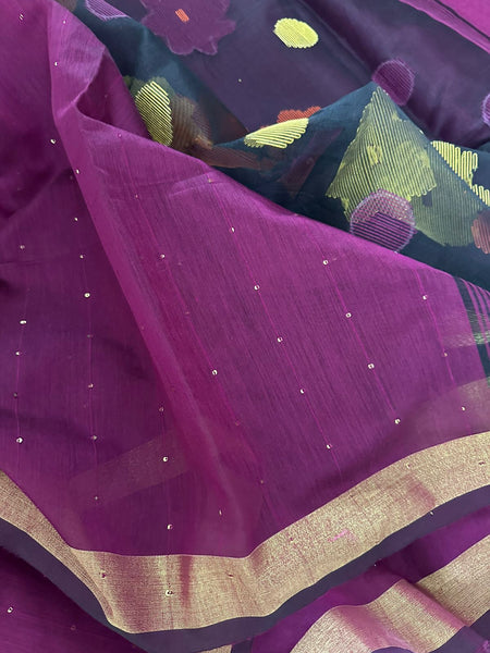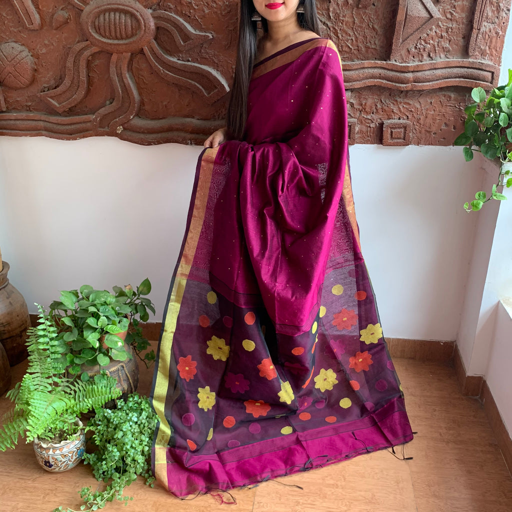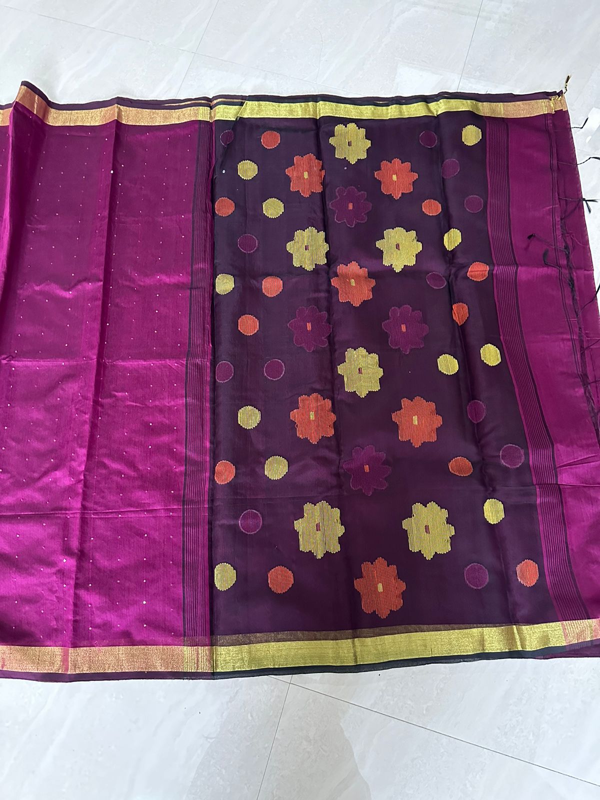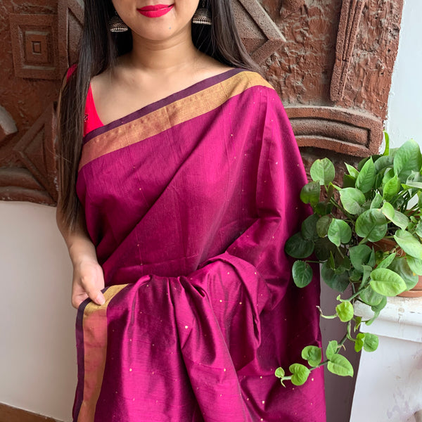 Handwoven silk cotton saree with body color running blouse material. Dry clean Only.