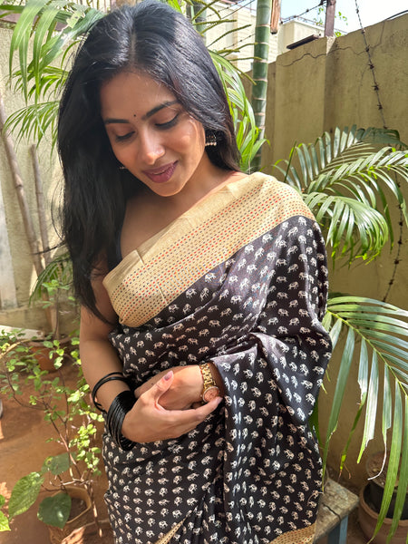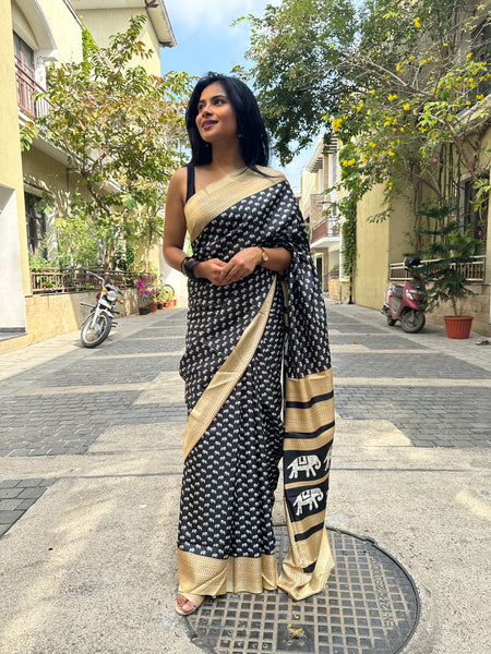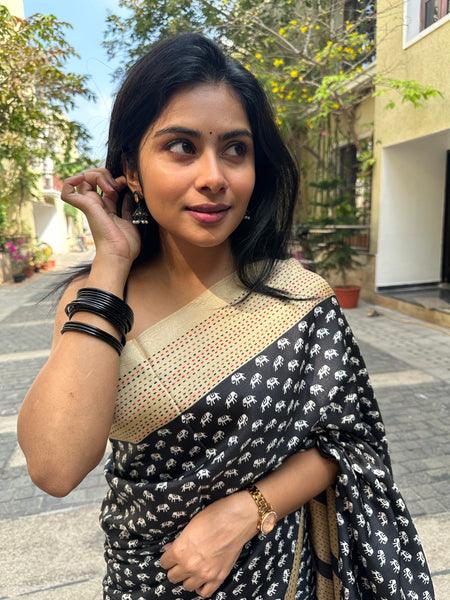 Malai silk ( not pure silk) with blouse material. Saree is soft and flowy, very easy to drape.