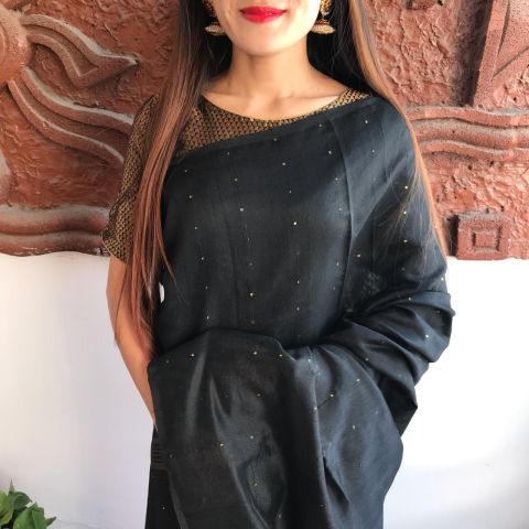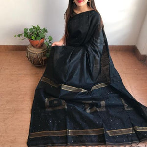 Silk cotton chumki saree with running body color blouse.