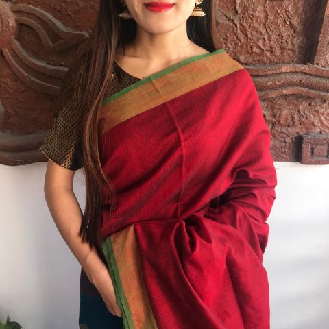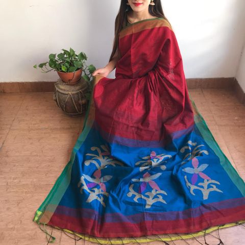 Handwoven silk cotton saree with jamdhani weaving in pallu. Saree comes with pallu color running blouse material.
